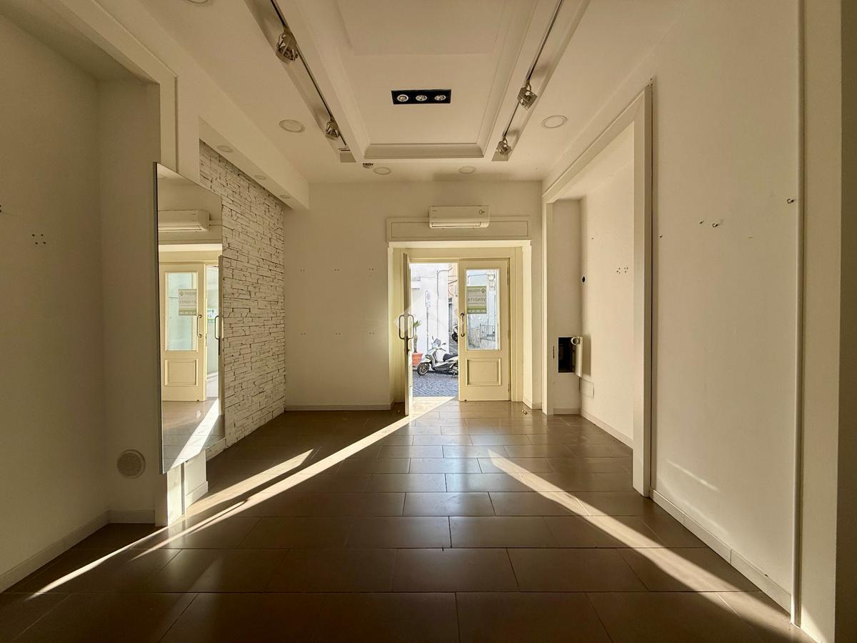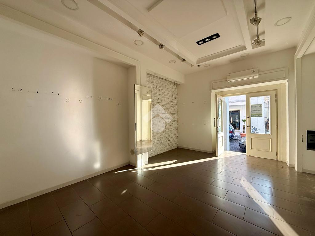 L’immobile si apre con un ingresso che conduce a un grande spazio principale, perfetto per esposizione o accoglienza clienti.