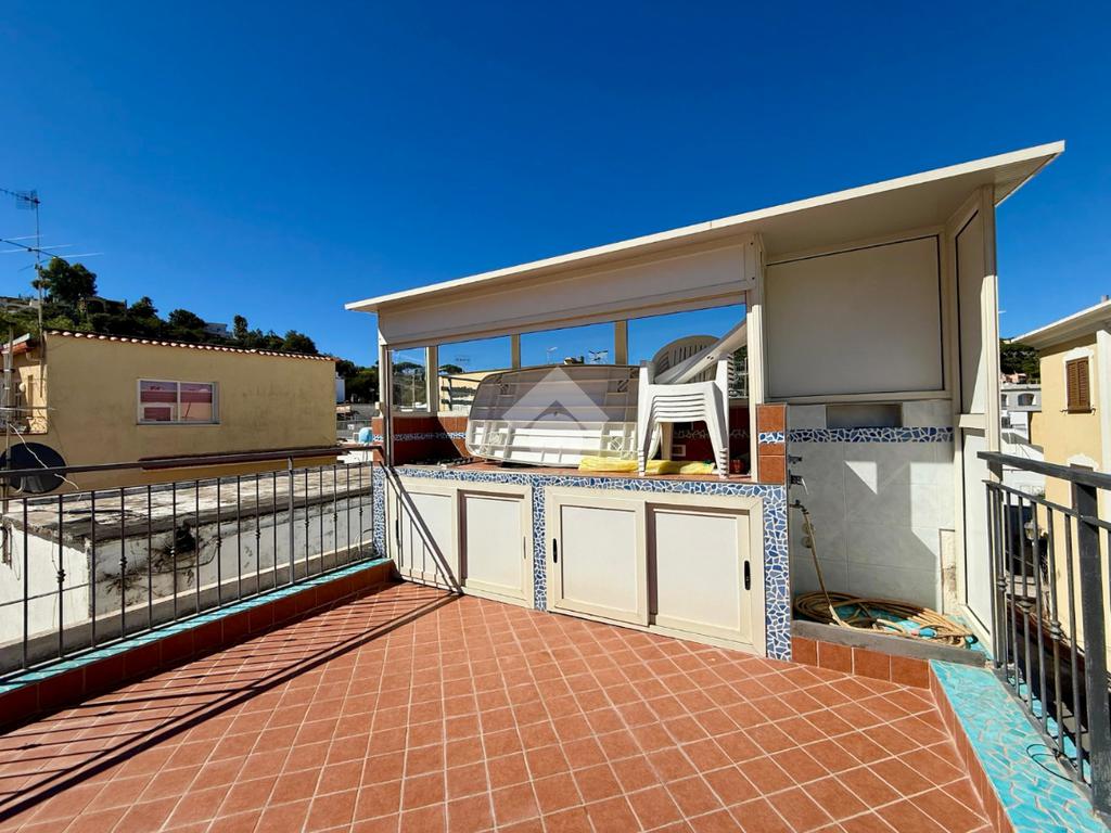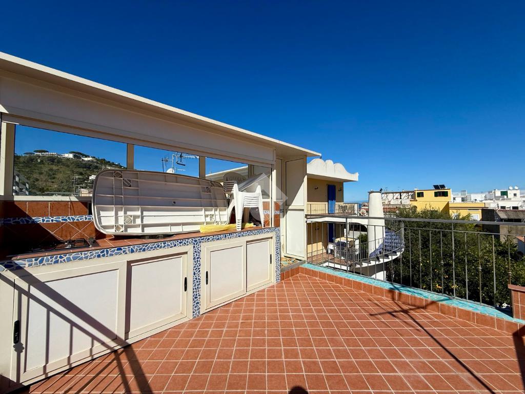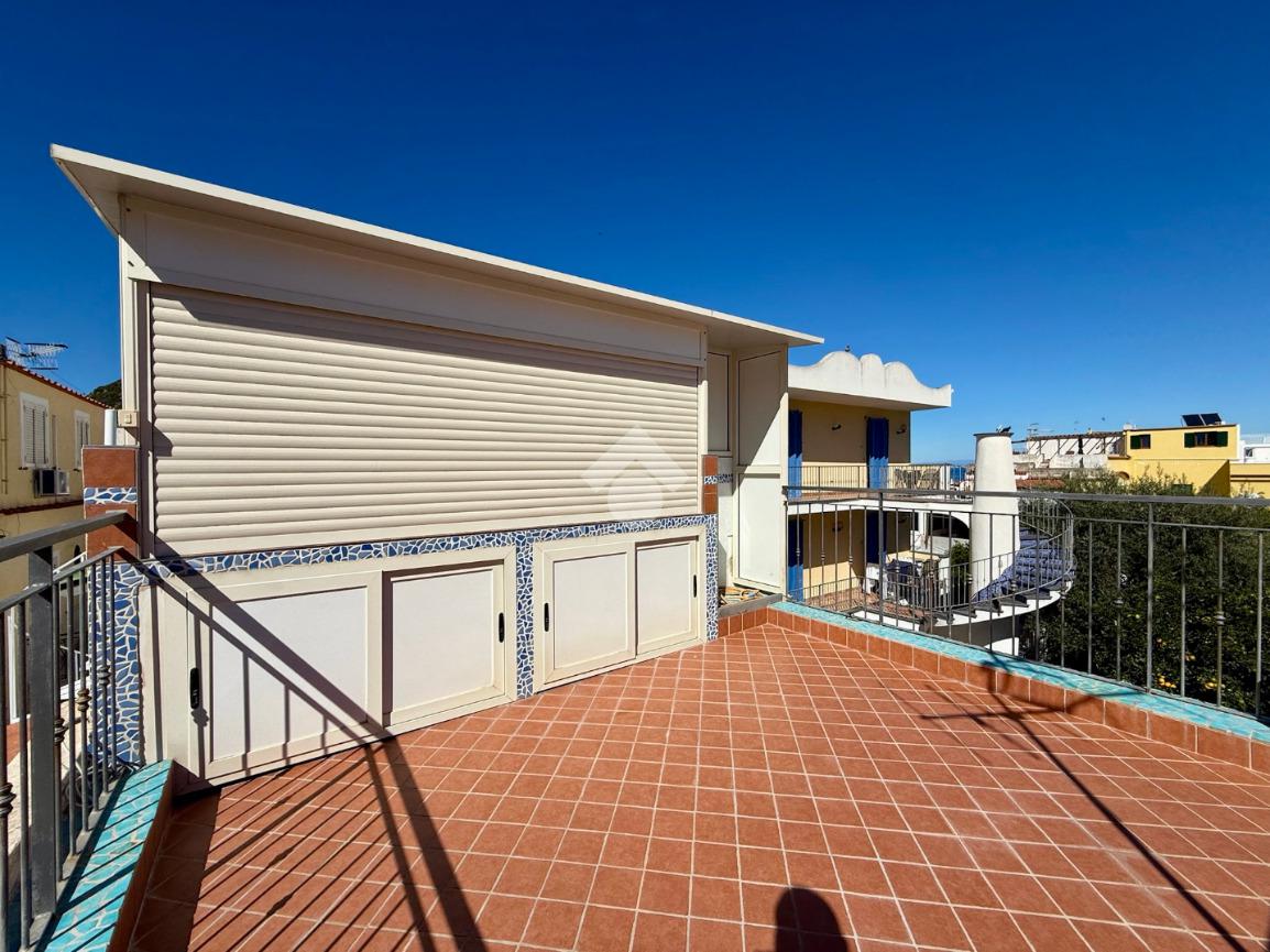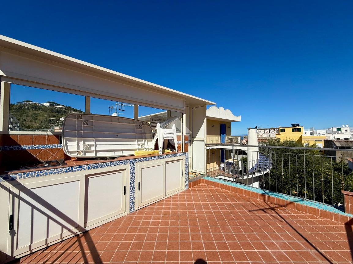 Da qui, attraverso una graziosa scala a chiocciola, si accede al terrazzo di copertura, un vero gioiello della casa: completamente attrezzato con cucina esterna e area relax, ideale per cene estive o per godersi la vista mare che incornicia il panorama di Lacco Ameno.